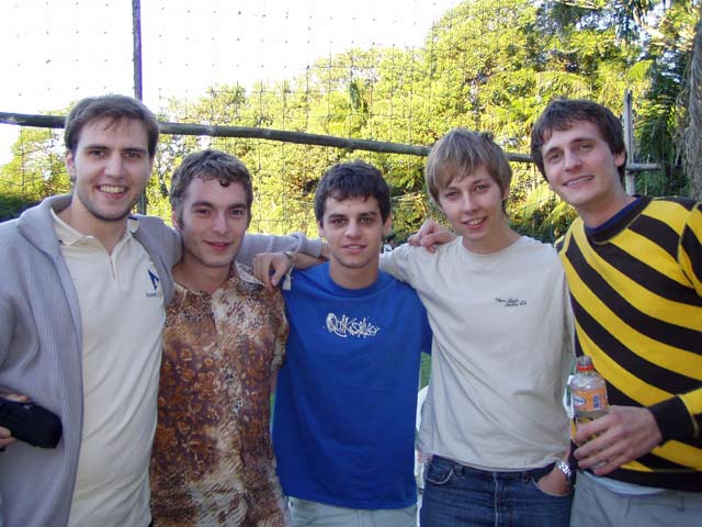 Auch wenn ich gestern spät heim bin, muss ich heute früh raus, denn schon ab 9:30 Uhr soll in São José das Fußballturnier deutsche gegen brasilianische Studenten stattfinden. Und ich muss mit dem Bus dahin fahren, Vera und Sebastian wollen erst mittags mit dem Auto zum Churrasco nachkommen. Als ich dann ankam, war es aber nur ein Fest von Carlos: Seine Verwandten und Freunde waren da, und keine anderen Brasilianer, die nach Deutschland gehen. Die hätte ich ja gerne einmal kennengelernt. Carlos’ Freunde sind alle ziemlich professionelle Fußballspieler, und da ich sowieso noch kaputt von gestern bin, lasse ich das mal lieber sein mit der sportlichen Betätigung. Wir machen ein Buch für Carlos mit Adressen von Eltern und Ilmenauern, wo sie anrufen können, und schreiben ihm etwas Deutsches Liedgut auf, von „Ein Prosit“ bis Tocotronic. Forsti, Steve und Anne sind aus Blumenau, Jaraguá und Joinville gekommen (Steve ist schon seit 4 Uhr auf den Beinen und seit 5 Uhr mit dem Bus unterwegs) und irgendwann treffen auch Vera und Sebsatian mit Milene und Tatiana ein. Es gibt lecker Essen, wobei Carlos’ 13-jährige Cousine nervtötend abwechselnd allen Jungs auf die Pelle rückt. Nach dem Essen wird der Kofferraum von einem Kumpel von Carlos aufgemacht, und der Brüllschrank im Kofferraum aufgedreht, dass es nur so wummt.