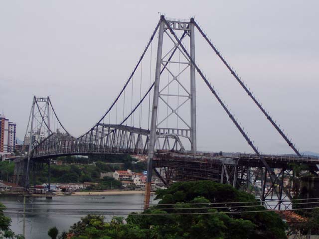 Wir entdecken den großen Buchladen Livraria Catarinense, und den großen Baum im Zentrum. Danach versuchen wir noch die alte Hängebrücke, die Ponte Hercílio Luz, zu besichtigen. Diese ist aber aufgrund von Restaurationsarbeiten für einige Jahre gesperrt. Die Brücke ist mit einer Länge von 819 Metern die längste Hängebrücke Brasiliens und verbindet seit 1922 das Festland und die Ilha de Santa Catarina miteinander. Sie hatte aber nur zwei Fahrspuren, und daher verbinden seit etwa 25 Jahren zwei hässliche Betonbrücken mit insgesamt 8 Fahrspuren Florianópolis mit dem Kontinent. Ab Montag werde ich täglich darüber fahren.